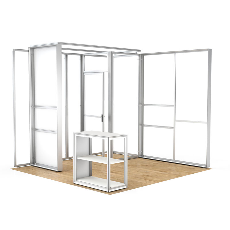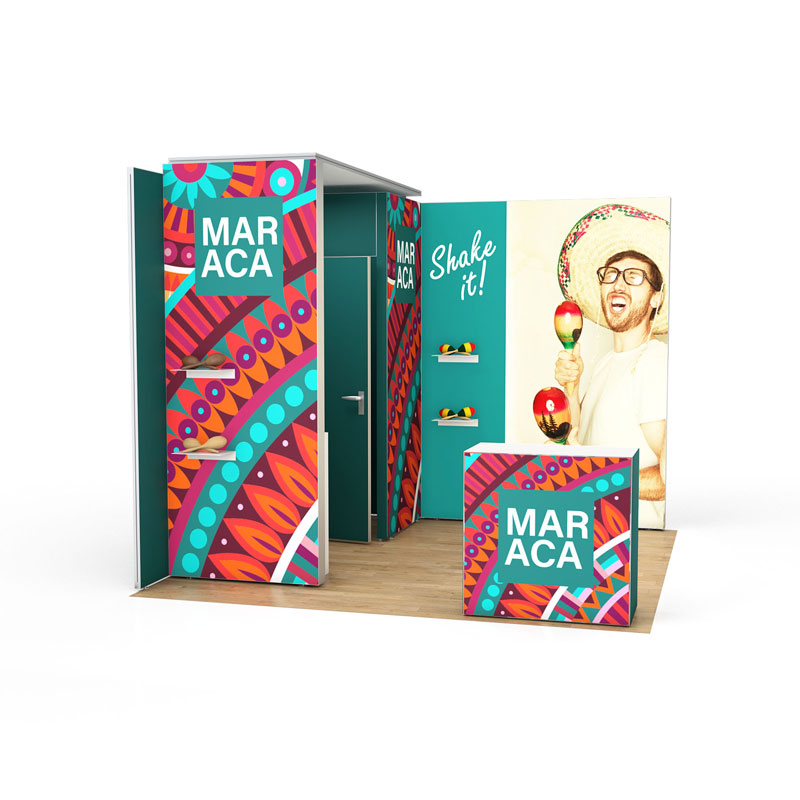 Octanorm Design Idea 15 is a stunning corner exhibit with large back lit fabric graphics, storage closet, shelves and counters.